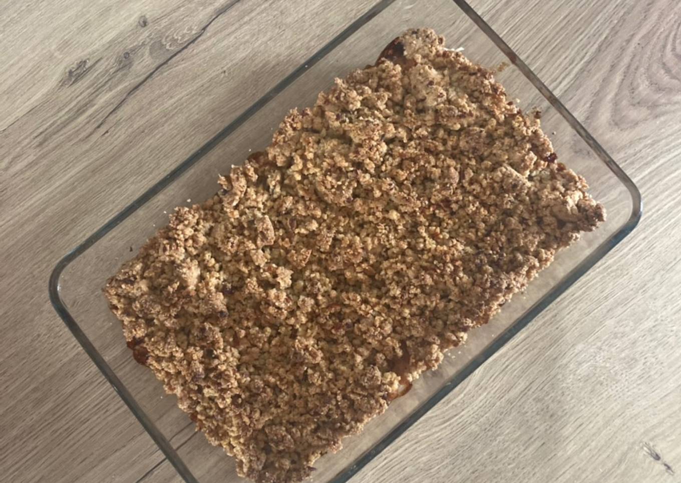 - Une fois les pommes cuites, les mettre dans un plat et repartir la pâte à crumble dessus