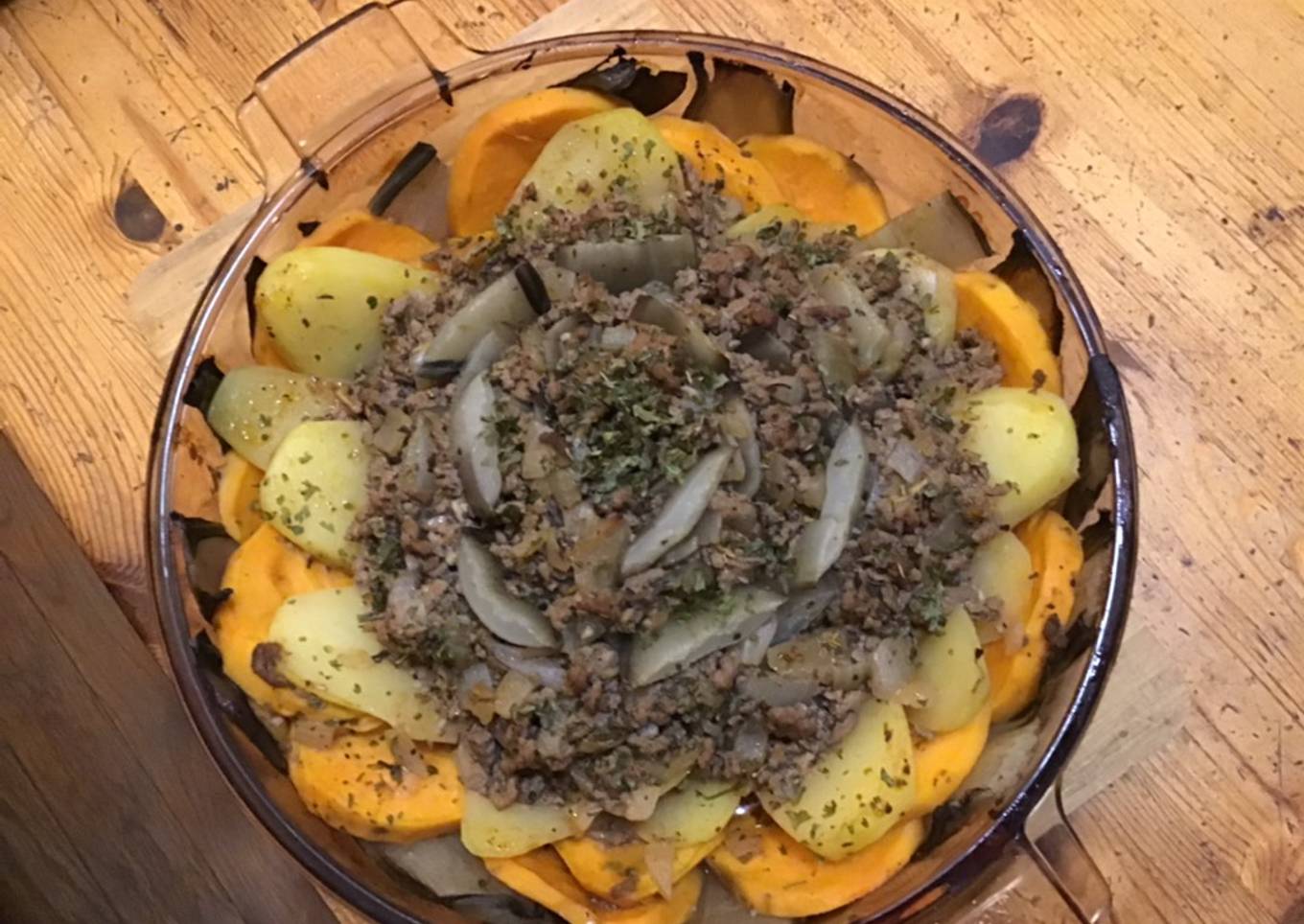 Blettes pommes de terre et patate douce au bœuf et oignon