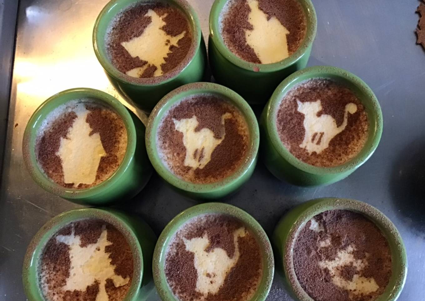 - Mélanger le restant de la poudre de noisettes avec le cacao saupoudrer les flans froids (avec des pochoirs pour faire de jolis motifs par exemple) mettre au frais au moins 4 h