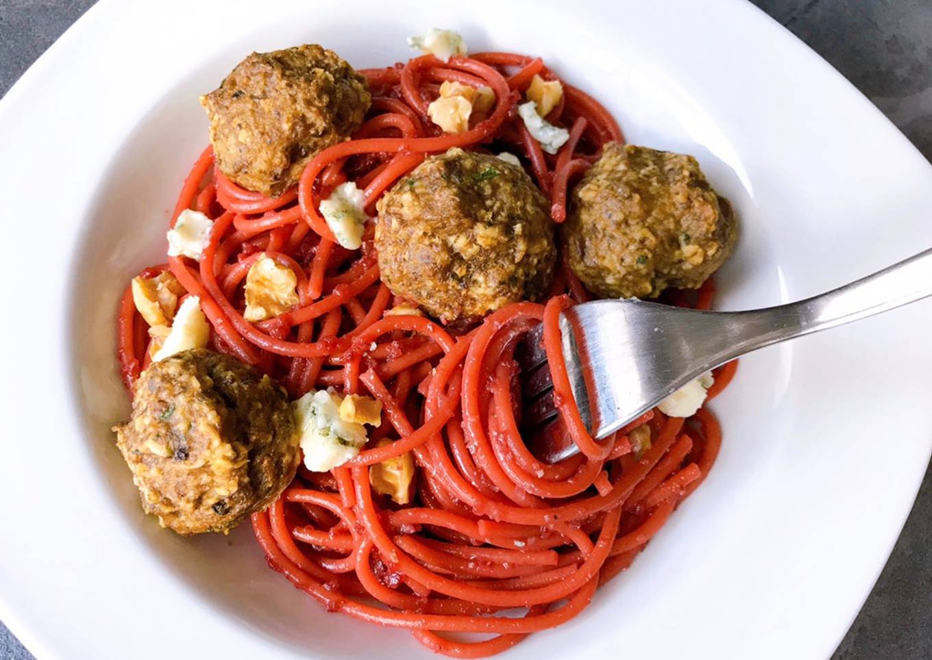 Spaghettis betteraves roquefort et boulettes de champignons Aussi sur Instagram @stl_cuisine