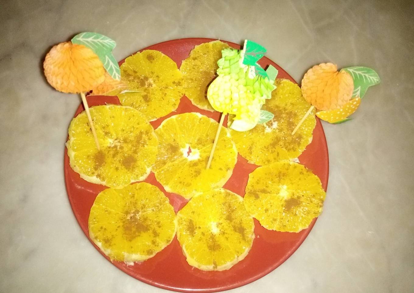 - Dans une assiettes plate on mis les rondelles des oranges saupoudrer avec de la cannelle