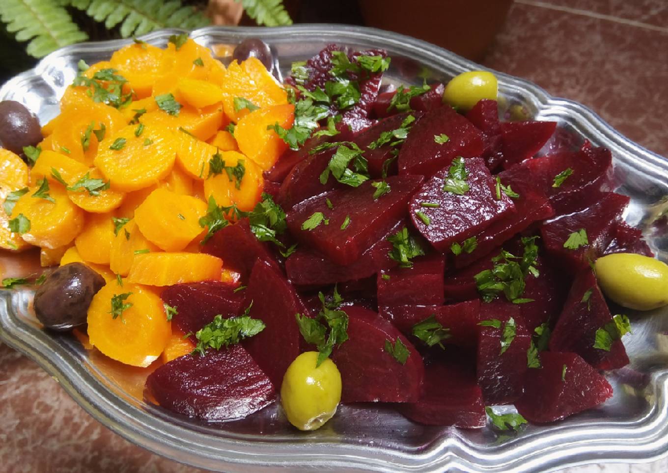 - Mettez la carotte et la betterave dans une assiette, assaionnez et décorez avec les olives et le persil ciselé.
