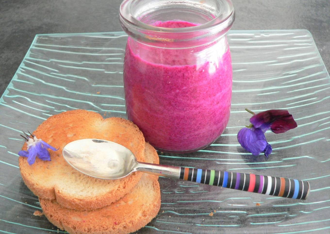 - Retirez la peau des betteraves,coupez les en morceaux. Mixez les avec le fromage émietté, 2 c à soupe de gelée de mûres maison,poivrez. Passez au chinois pour plus d'onctuosité.
