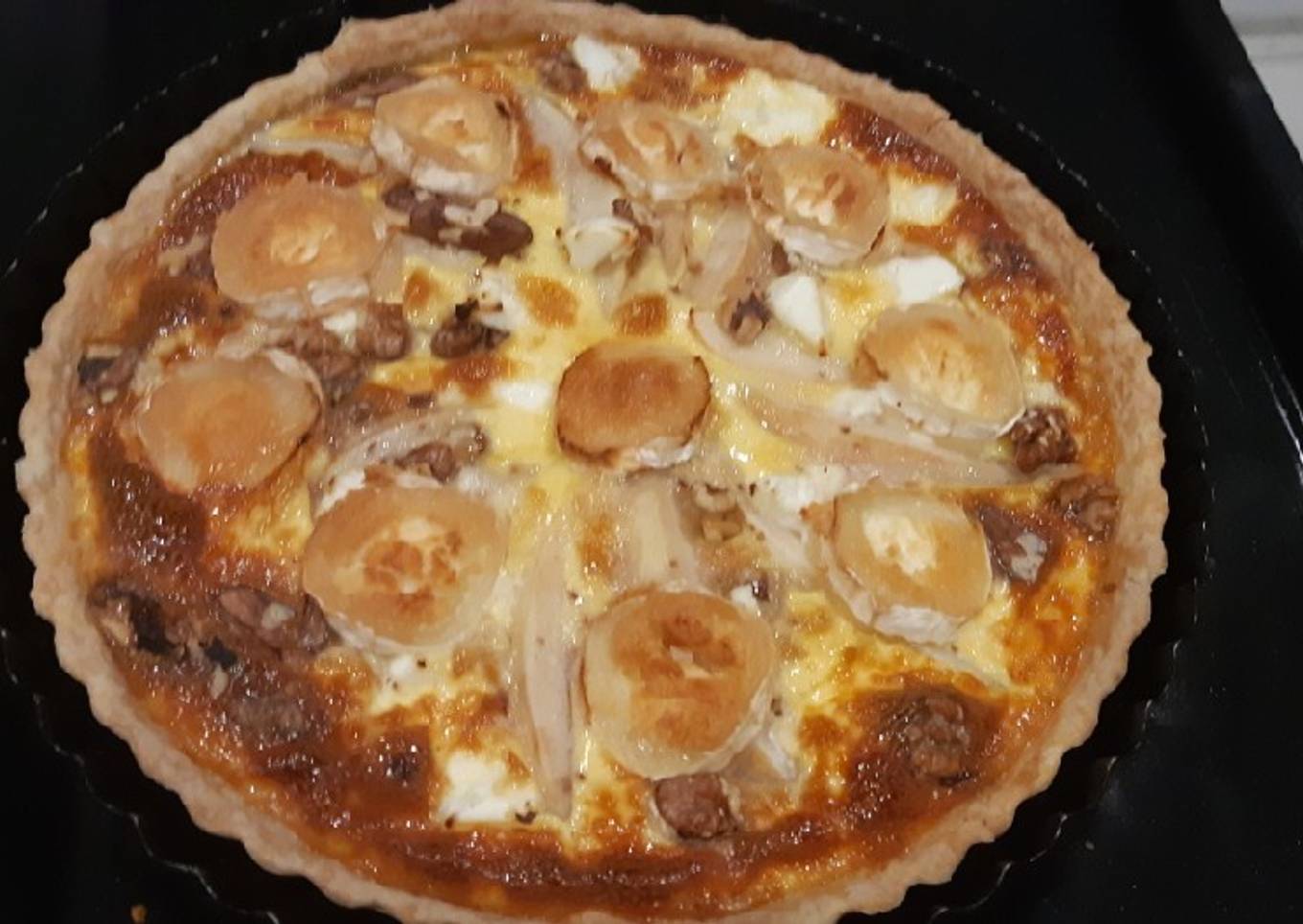 Pour le montage on met les poires les noix le fromage de chèvre le miel. Ensuite on verse l appareil sur la tarte comme sur les photos.