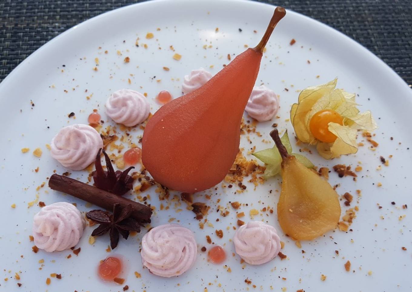 Poire pochée aux épices, billes aux épices, chantilly à la framb