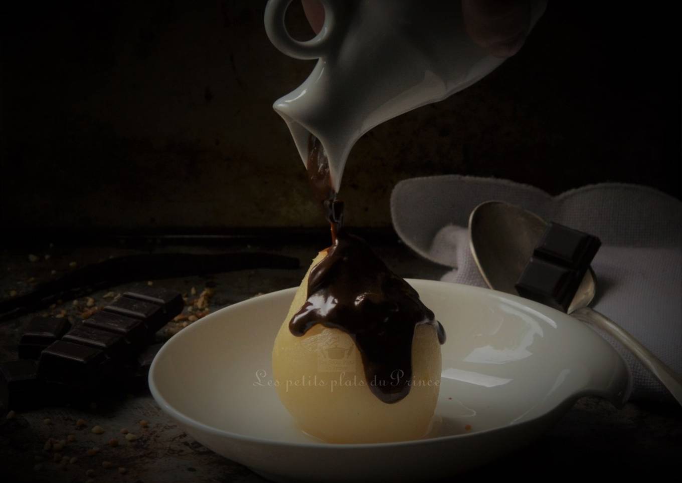 Poire pochée nappée de chocolat chaud