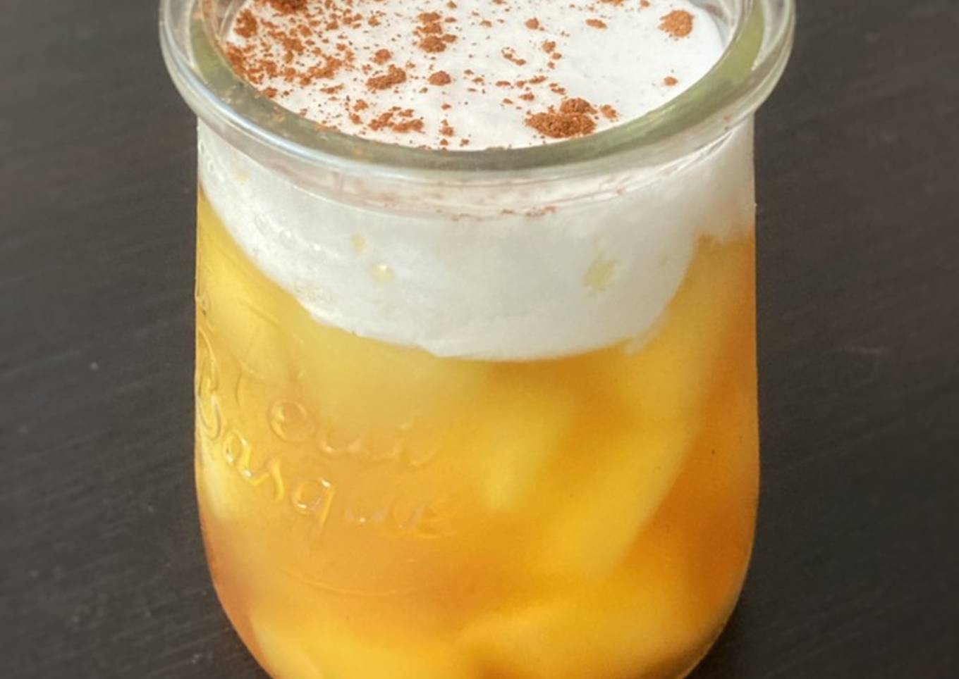 - Placer le lait de coco au frais. Au moment de servir, verser le lait de coco jusqu’au sommet de la verrine et saupoudrer de canelle. (Vous pouvez aussi le remplacer par une crème chantilly).